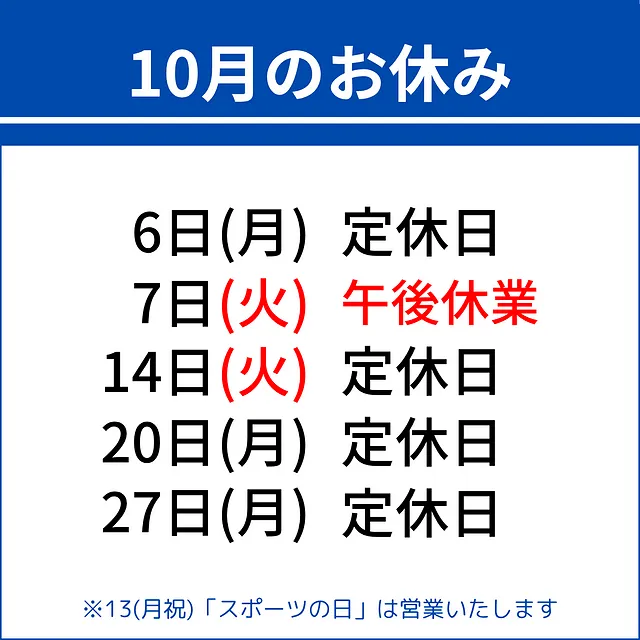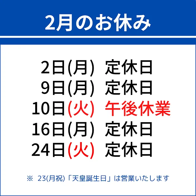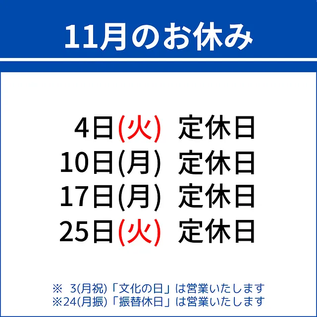 定休日: 月曜日 ※祝日の場合は翌火曜日を休業します